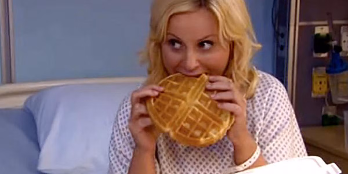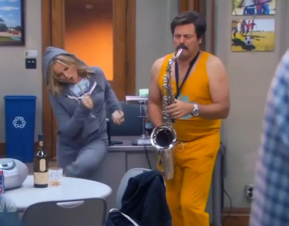Favorite Moments: Sarah's favorite moment is when Leslie and Ron get locked in the old Parks & Rec office in City Hall by their friends to force them to make up their feud and become friends again. When everyone returns the next morning, Ron is wearing tight yoga-style clothes (totally out of character) and playing the saxophone, while Leslie is making up lyrics to "We Didn't Start the Fire" in a manic state of exhaustion. Hunter appreciates when Ron is seen climbing into an air duct in City Hall to retrieve his emergency pack that he stashed there in case his wife, Tammy I, ever came back for him so he could flee. He also loves any scene where Ron is eating ungodly amounts of bacon and Leslie is eating her stress through waffles (something Sarah also does).
