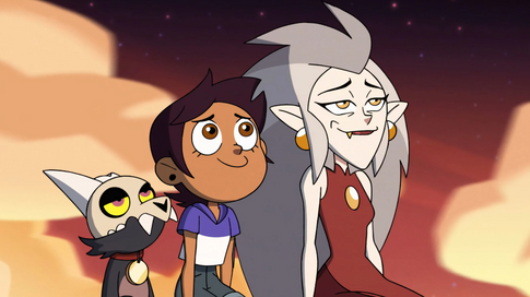 Premise: Luz Nocida, a human girl, accidentally transports to the Demon Realm, where she meets Eda the Owl Lady, King the Titan, and Hooty the Owl and moves into The Owl House with them. Luz trains with Eda and later attends school to learn magic. She makes friends, including Amity, a classmate with whom she develops romantic feelings. Everyone has to team up to take on Emperor Belos, a former witch hunter (and human) who wants to eradicate magic on the Boiling Isles. There's also a character named Hunter, who begins the show as Belos' right-hand man but undergoes a transformation and becomes a positive force.