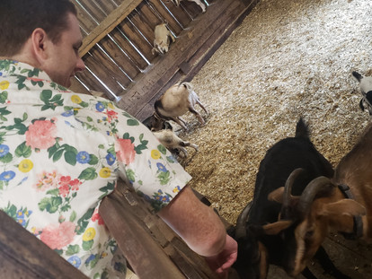 The next day was Sarah's dad's birthday, which they celebrated that night with roast beef from Art's (a local delicacy) and some ice cream cake. During the day, Sarah and Hunter went to explore Conner Prairie, a living history museum where she had grown up taking field trips and even once saw a Beatles Symphony on the Prairie show. It features a recreation of a 19th-century village, complete with an inn, general store, doctor's home practice, tailor shop, blacksmith, carpenter, potter, and other town staples from circa 1836. They toured the William Conner House, one of the oldest brick homes in the state, watched some kids practice spinning wool into fibers, and met some goat friends in the farm barn. At the carpenter's shop, Sarah was able to get the living historian to break character and deliver some juicy gossip about the working conditions at Conner Prairie (which didn't sound all that different from the challenges Sarah had found in her nonprofit career). At the potter's shop, they watched female potters make pots on the wheel and asked questions about the role of women in Prairietown. They met the only Black matriarch in the neighborhood, who had described some discrimination she'd faced at the town doctor, whom they visited next. They vacated his office quickly upon being offered the option to be treated with leeches. In the gift shop, Hunter purchased a mug that the potter had made. They skipped the giant hot air balloon that offers a bird's-eye view of the 200-acre park due to Hunter's fear of heights.