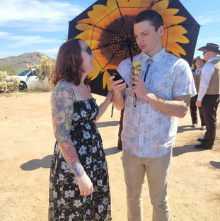 Seth and Mel's wedding was out in the Sonoran Desert on what turned out to be a scorching day. The afternoon ceremony was moved up to the morning in an attempt to beat the heat. It was a small ceremony with only close friends and family. The Superstitious Mountains rose in the background as Bonnie walked Seth down the aisle in her neon-cactus Jane Fonda dress. All the groomsmen and the groom wore full cowboy attire, complete with bolo ties, boots, and hats. (Hunter also wore a buffalo bolo tie that he'd snagged at the Boot Barn in an attempt to be more on-theme.) Mel walked down the aisle in a gorgeous white lace dress accompanied by her father. The officiant was a childhood friend whom Sarah and Seth had gone to school with. After the heartfelt ceremony, families of the bride and groom posed for photographs before breaking for a siesta. The evening reception was held in Mel's family's backyard. Seth, who is very musical, curated the playlist in place of a DJ. Dinner was tacos from a local restaurant. There were speeches from Mel's dad, Seth, and Sarah's mom, as well as the maid of honor and the best man (who was already quite drunk but managed to hold it together). The mother-son dance was first to Rod Stewart's "Forever Young" and then the father-daughter dance. The couple's first dance together was elevated by the family's tradition of maracas, which were scattered about the audience. Any time the crowd shook the maracas, Seth and Mel had to kiss to ward off bad luck. There was a lot of maraca shaking that night! There were cocktails, cake, and dancing by the pool. They left at 1 am EST, but well before the reception ended and the bride, groom, and groomsmen jumped in the pool (in their wedding outfits!) at 5:30 am EST. Before they left, Sarah spotted a steer skull on one of the big planters decorating the reception, so that was the set the couple chose to represent the wedding day (ignore the Yellowstone reference).