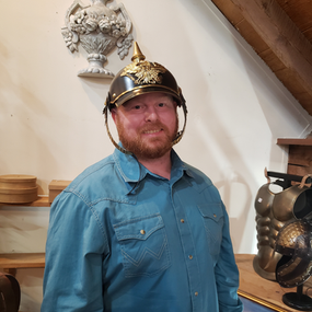 Hunter trying on a Greek helmet, and Seth trying on a "picklehaube," a helmet that originated in Russia that German and Prussian soldiers wore during the 1800s-1900s at the Log House's bizarre and fun gift shop. Photos of the Log House, including the fire damage.